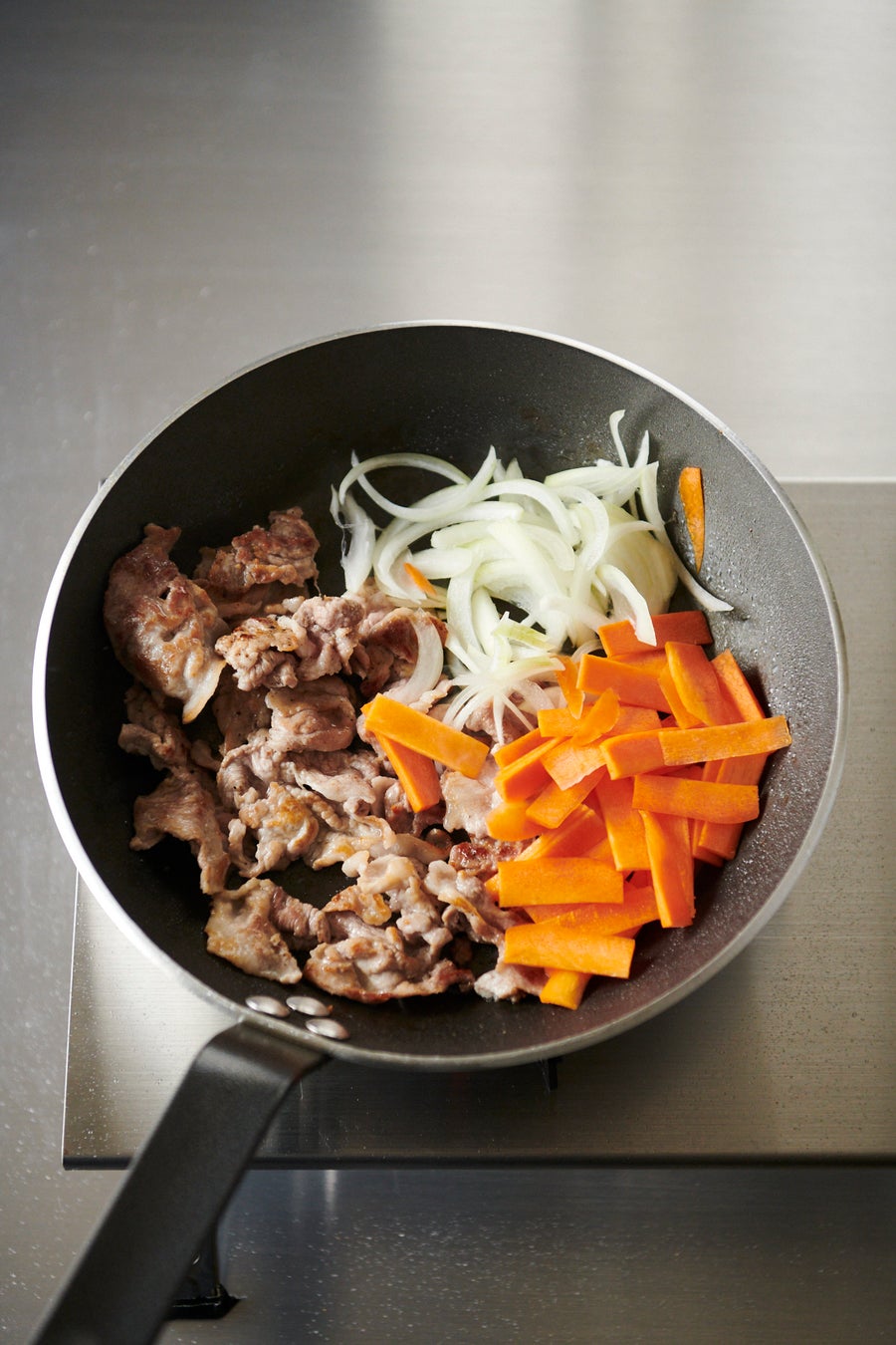 ▲肉はできるだけ重ならないように広げ、動かさずにじっくり焼く。焼きつけることで火が早く通り、脂が出やすくなる。 〈2〉空いたところに玉ねぎとにんじんを加え、それぞれ1分ほど焼き、徐々に全体を炒め合わせる。