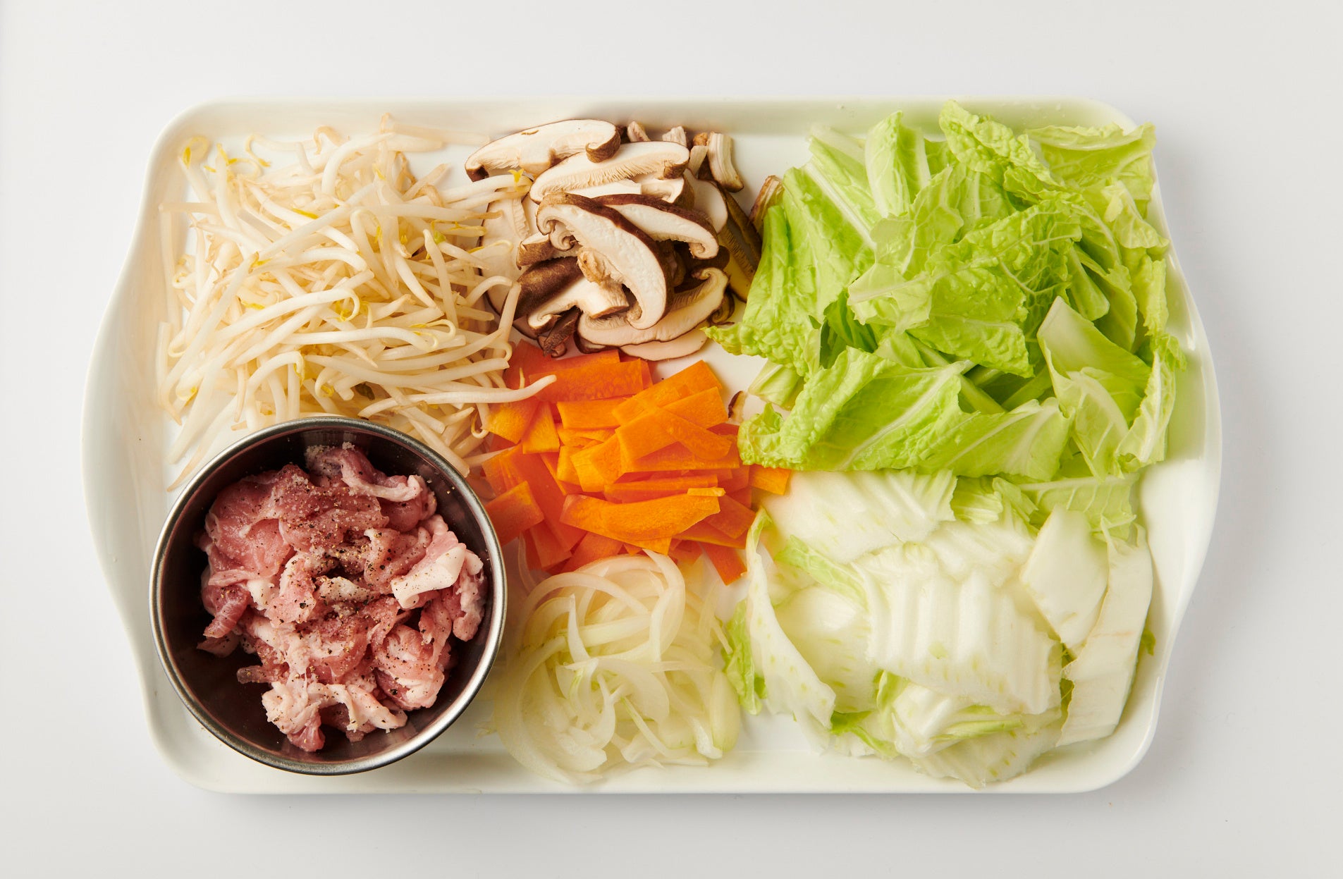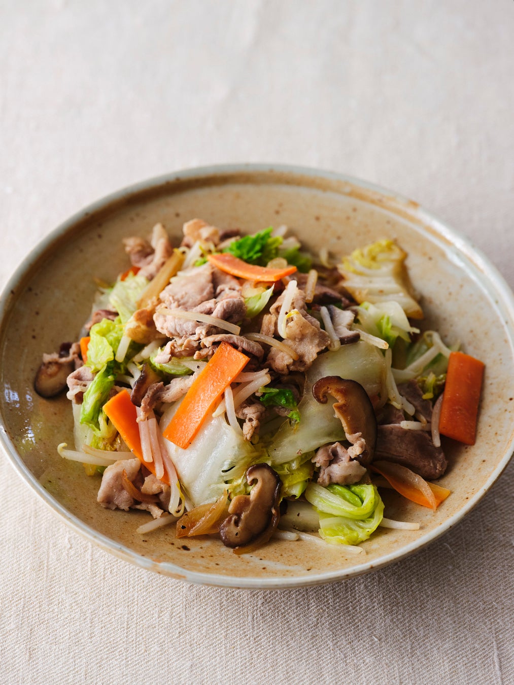 玉ねぎ…1/4個 ▶薄切りにする にんじん…4㎝ ▶短冊切りにする しいたけ…2枚 ▶軸を落として薄切りにする 白菜…葉大2枚(200g) ▶軸は長さ3㎝のそぎ切り、葉は長さ3㎝に切る もやし…1/2袋(100g) ▶できればひげ根を取る 豚こま切れ肉…150g ▶大きい場合は長さ3㎝に切り、塩・こしょう各少々をふる サラダ油…小さじ2 酒…小さじ2 塩…ふたつまみ こしょう…少々 しょうゆ…小さじ1