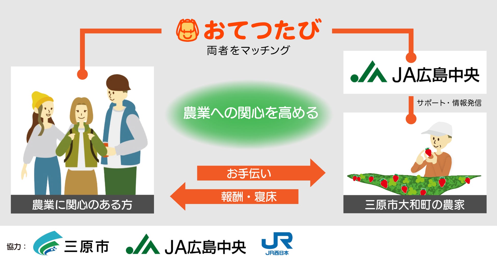 地域の季節的・短期的な人手不足をキッカケに地域の関係人口を創出するマッチングサイト『おてつたび』を運営する株式会社おてつたび(代表取締役CEO:永岡里菜、本社:東京都渋谷区、以下「おてつたび」)は、「せとうちファンづくりプロジェクト(広島県の竹原市・三原市・尾道市、JR西日本)」と連携し、せとうち3市(竹原市・三原市・尾道市)において、地域事業者の人手不足を解消しながら地域産業にふれるきっかけを作り、3市のファン(関係人口)が継続的に創出される仕組みづくりに取り組んでおります。今回は、三原市大和町にて広島中央農業協同組合(以下、JA広島中央)と連携し、地域の農業に興味を持つ方を対象としたマッチングを行い、仕事としての農業を経験するとともに、地域の農家やJA広島中央との交流の機会を提供することで、担い手不足の解消と農業への関心を高めるきっかけ作りに取り組みます。