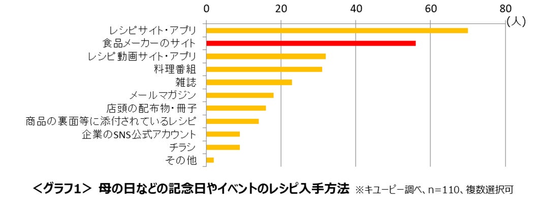最新の調査によると、記念日やイベントのレシピをどのように入手しているか尋ねたところ、「レシピサイト・アプリ」に次いで「食品メーカーのサイト」が挙がり、多くの人がレシピ検索に食品メーカーのサイトを活用していることが分かりました(グラフ1)。次いで「レシピ動画サイト・アプリ」が入ることも、近年の特徴と言えます。 ブーケサラダ特設サイト(4月21日(木)から公開)