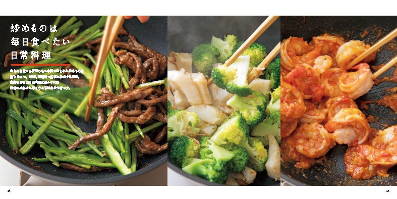 5つのメソッドのうちの1つは「強い火力は不要」という、これまでの炒めもののイメージを覆すもの。強い火力で一気に炒めるのは、プロの調理場ならではの特別な手法。一般の家庭で作る場合の成功の秘訣は、「油を上手に使って中火でじっくり火を通すこと」(本書より)。油の膜で食材がコーティングされ、みずみずしさや香りを封じ込めるため、野菜がシャキッと仕上がります。 さらに5つのメソッドに加え、素材の切り方、おいしさを保証するひと手間、調味料の選び方などのコツを満載。この本の通りに作れば、炒めもの名人になれること間違いなし!