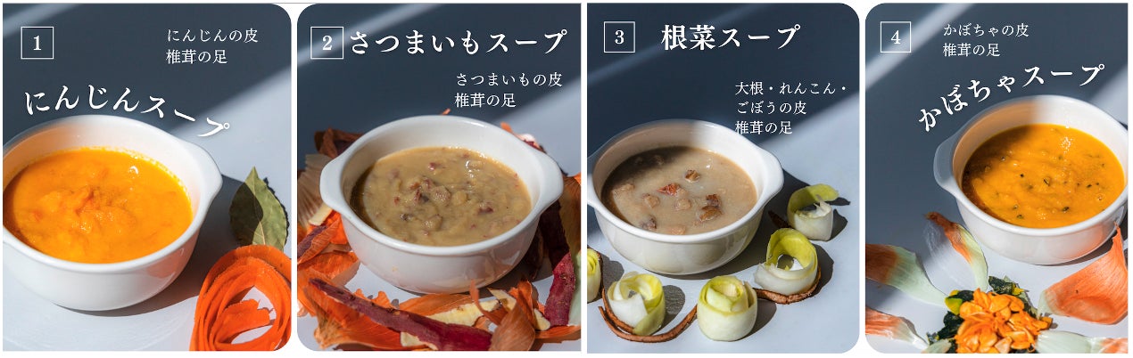 食品工場で廃棄されている有機野菜の皮や椎茸の足をスープに活用 「皮ったスープ」(全4種)には、食品工場で廃棄される有機栽培の野菜の皮と、椎茸の足(軸)を使用しています。有機栽培で大切に育てられ、おいしく栄養のある野菜の皮を使うことで、栄養価の高いスープに仕上がるとともに、食品廃棄物の中にもおいしく栄養豊富な食材があることに気づき、未来の食への第一歩として提案します。 <スープに使用されているフードロス食材の割合> ・さつまいもスープ:さつまいもの皮5%+椎茸の足5%=合計10%