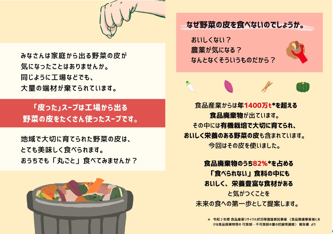 (※1) FUTURE FOOD INNOVATION WORKSHOPについて 様々な背景を持つ人々が共創し、食が抱える社会課題を解決するための新たなアイディアを創り、そのアイディアを実際の社会に展開すること、そこで得た学びから次世代のリーダーを育てることから、食の未来に繋げていく社会実装型プロジェクトです。 (※2)令和2年度 食品産業リサイクル状況等超採択事業(食品関連事業者における食品廃棄物等の可食部・不可食部の量の把握等調査)報告書より ■「皮ったスープ」について 現在、食品産業からは、年1,400万トンを超える食品廃棄物が出ています。その中には、食べられるにも関わらず捨てられている食材や皮(端材)が多数あります。 今回スープを製造いただいた工場では、有機栽培の野菜を使用した食品が製造されています。その過程で、ニンジンやさつまいもなど有機野菜の皮が年間各50~100kg、椎茸の足(軸)にいたっては年間10トンも廃棄されており、その廃棄量もさることながら、廃棄費用も経営に大きく負担となっている状況があります。