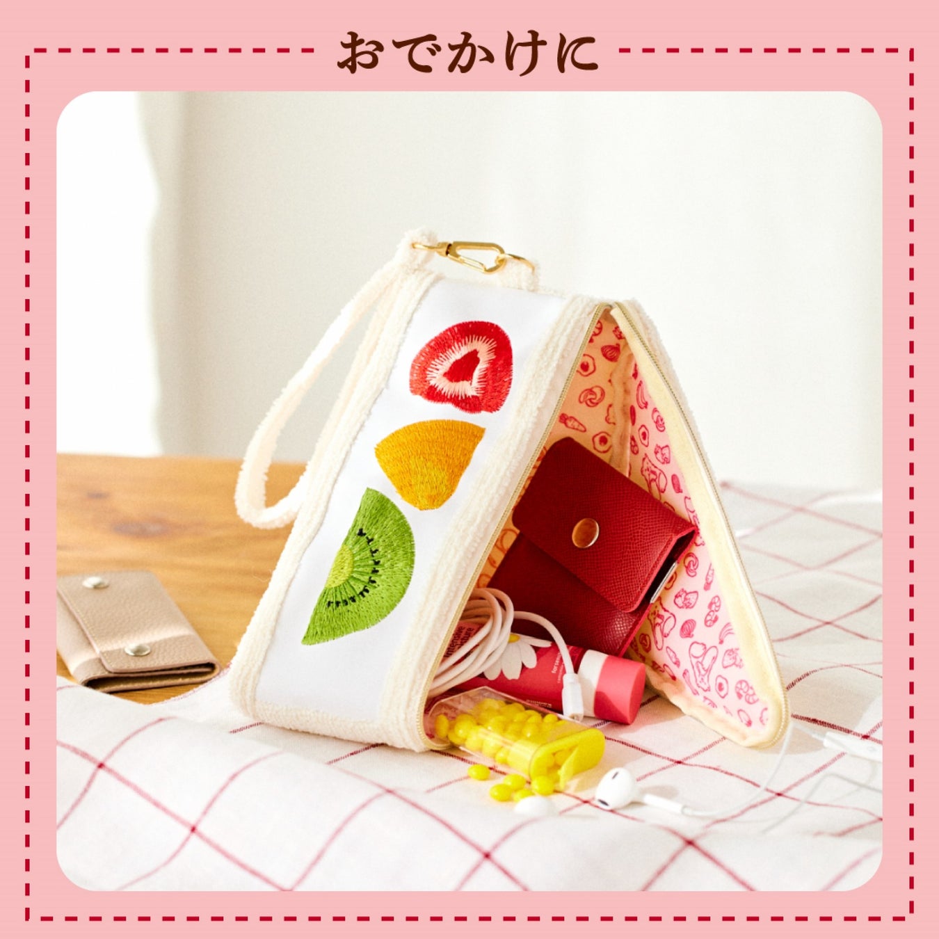 ふわふわの食パン、なめらかな生クリーム、新鮮なフルーツなど、細かいところまでこだわった本物そっくりのデザインがポイント。メルヘン柄の裏地や公式キャラのゴールドチャームのさりげないかわいさにもきゅん♡ ▼ガバッと開いて使いやすい♪ 裏地はフルーツ&野菜のメルヘン柄