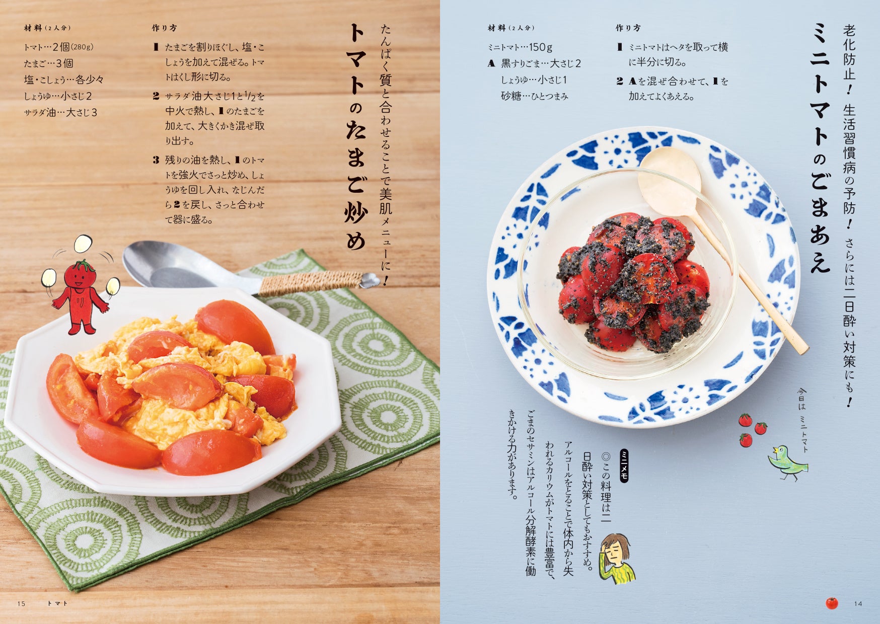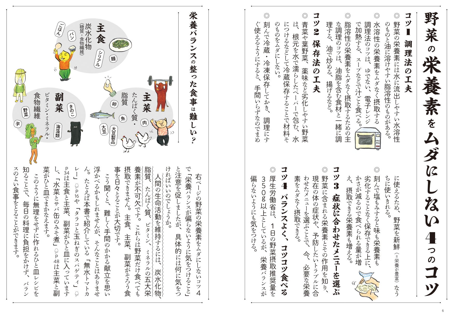 野菜単体を取り上げ、代表的な栄養素や作用を紹介しています。そしてレシピごとに期待できる効能やおいしく栄養素を摂ることができるレシピのコツを掲載。あえるだけの簡単レシピから主菜になる満足レシピまで、各野菜に合わせたレシピをゆる~いイラストとともに紹介しています。