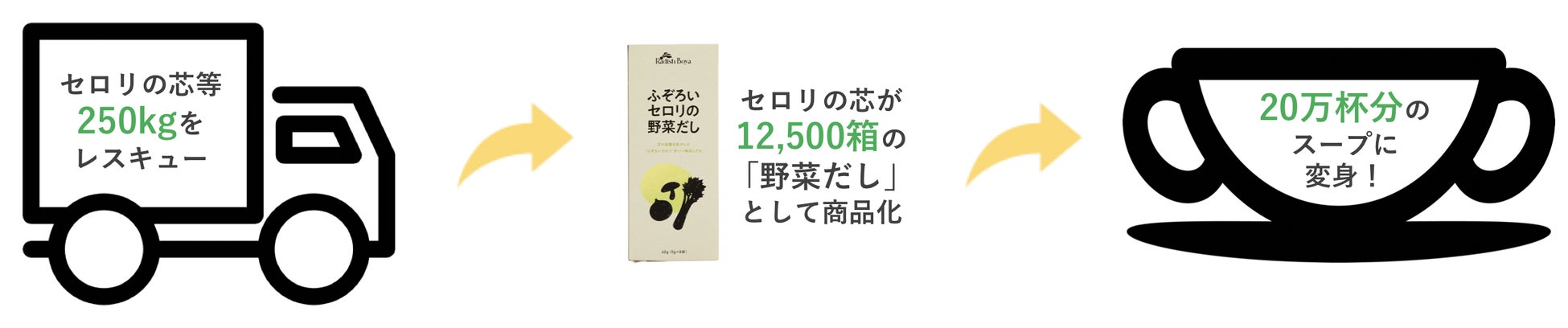 「らでぃっしゅぼーや」では「ふぞろいセロリの野菜だし」の開発・商品化のため、廃棄予定だった約250kgのセロリの芯と幼葉をレスキューすることができました。この原料から作られた商品の生産数は12,500箱(1箱あたり5g×6袋入り)で、一杯のスープに換算すると20万杯分(※一杯分は125mlで換算)となります。