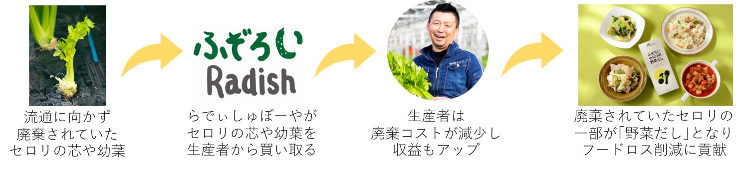 「らでぃっしゅぼーや」でもったいない部位をレスキューすることで、生産者の廃棄コストの減少、さらには原料買い取り分の収益アップにも貢献できました。「ふぞろいセロリの野菜だし」開発をきっかけに、さらにレスキューできる食材を増やしていきたいと考えています。