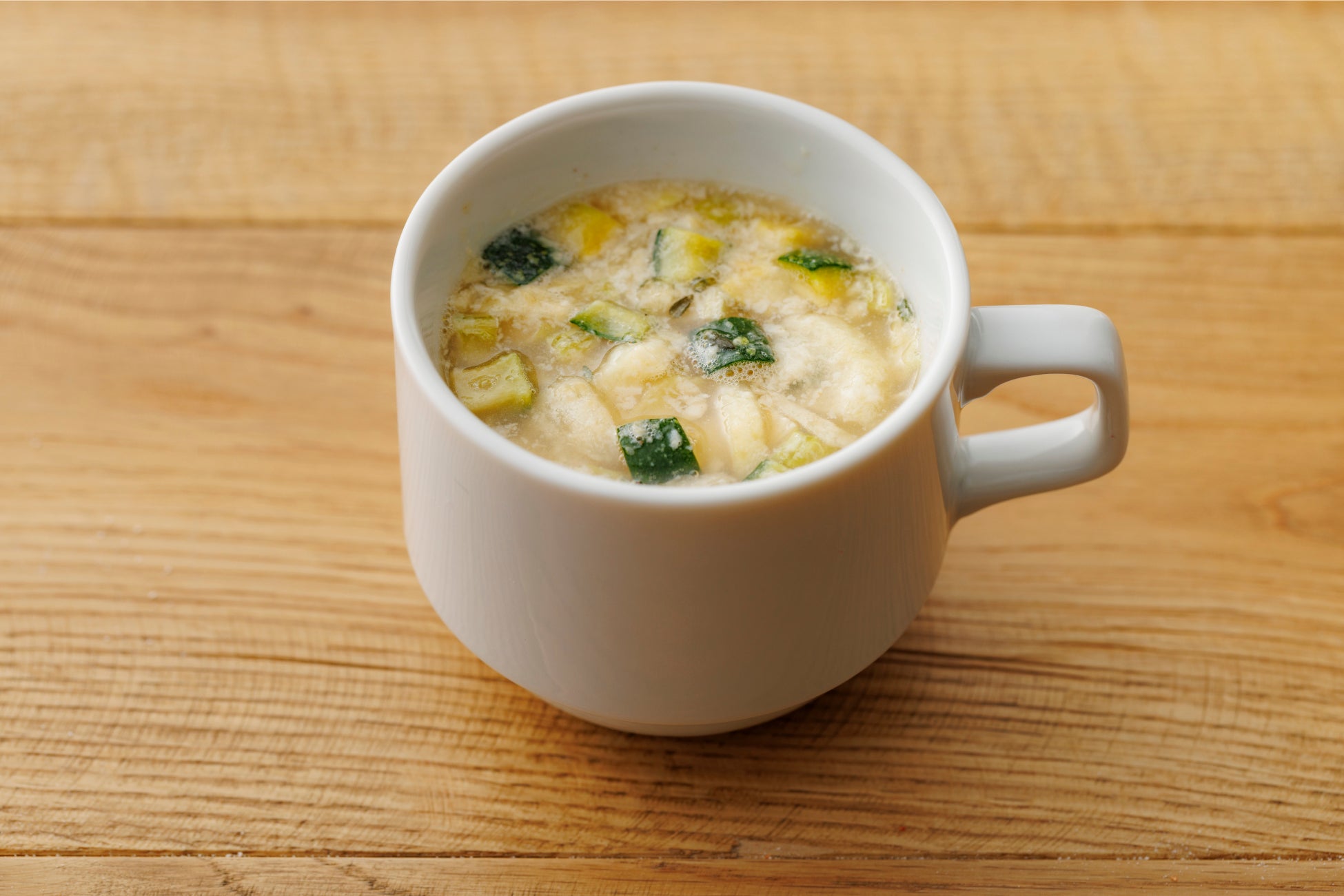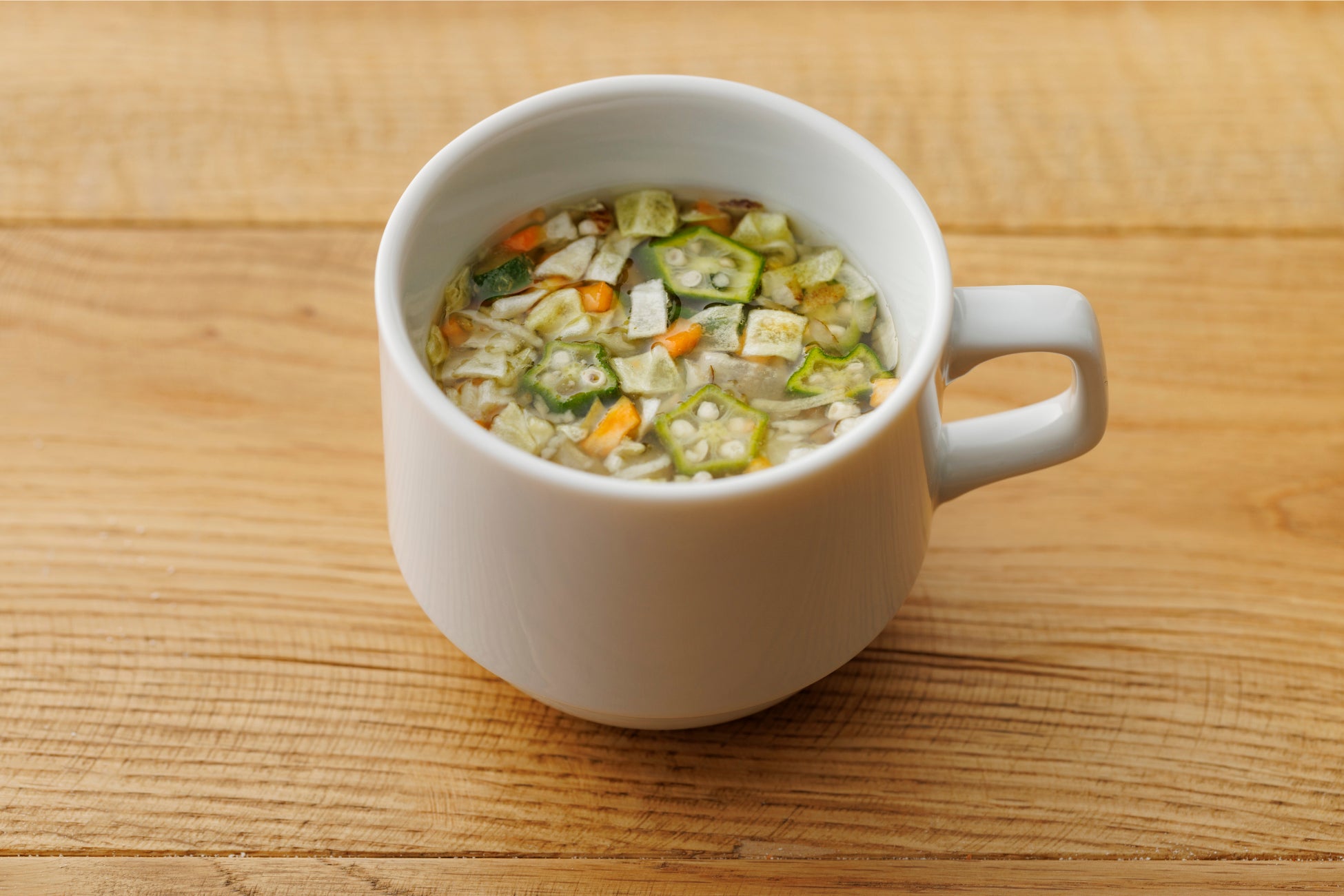 野菜やしいたけのだしがベースの、生姜が効いたベジタリアンのスープです。とろろやオクラのとろみに、野菜のシャキシャキ感や色合いも楽しめます。