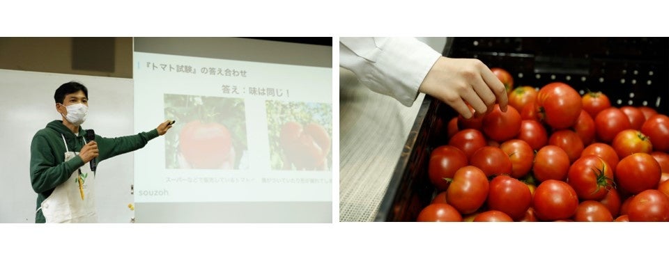 授業では『トマト試験』と称して、目隠しをして規格外のトマトと普通のトマトを試食し、どちらがおいしいかを回答をしました。学生たちは2つのトマトを食べると、「新鮮でとてもおいしい!」「比べるのが難しい」と、よく味わいながら検討。76%の学生が、規格外トマトの方が「おいしい」と回答しました。トマト農家「ロココファーム」の東海氏が“実は味は変わらない”と説明をすると、見た目が味に影響しないことに驚いている様子でした。