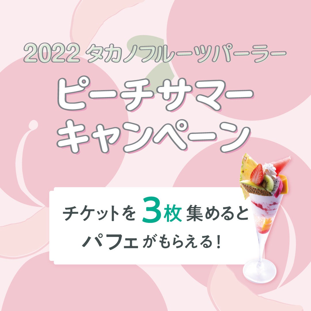 チケット3枚でパフェがもらえる!2022ピーチサマーキャンペーンのお知らせ「桃のパフェ」「桃のプレートデザート」「桃のワッフル」「シーズナルトライフル 桃」をおひとつご注文につき、チケットを1枚お渡しいたします。集めたチケット3枚で、次回ご来店時に「プレゼントフルーツパフェ」をプレゼント。