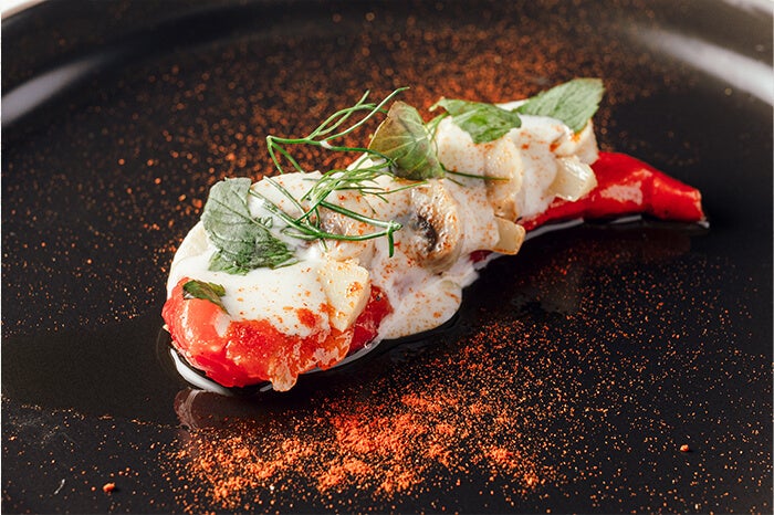 香ばしくローストしたパプリカ、白ワインビネガーでマリネしたマッシュルームのオイル漬けを合わせました。 コクのある塩ヨーグルトのソースをたっぷりと絡めてお召し上がりください。