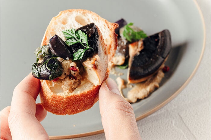 ジャンボマッシュルームを香ばしく焼き上げ、マッシュルーム入りのフムスとフレッシュハーブを合わせた秋茄子とともに。