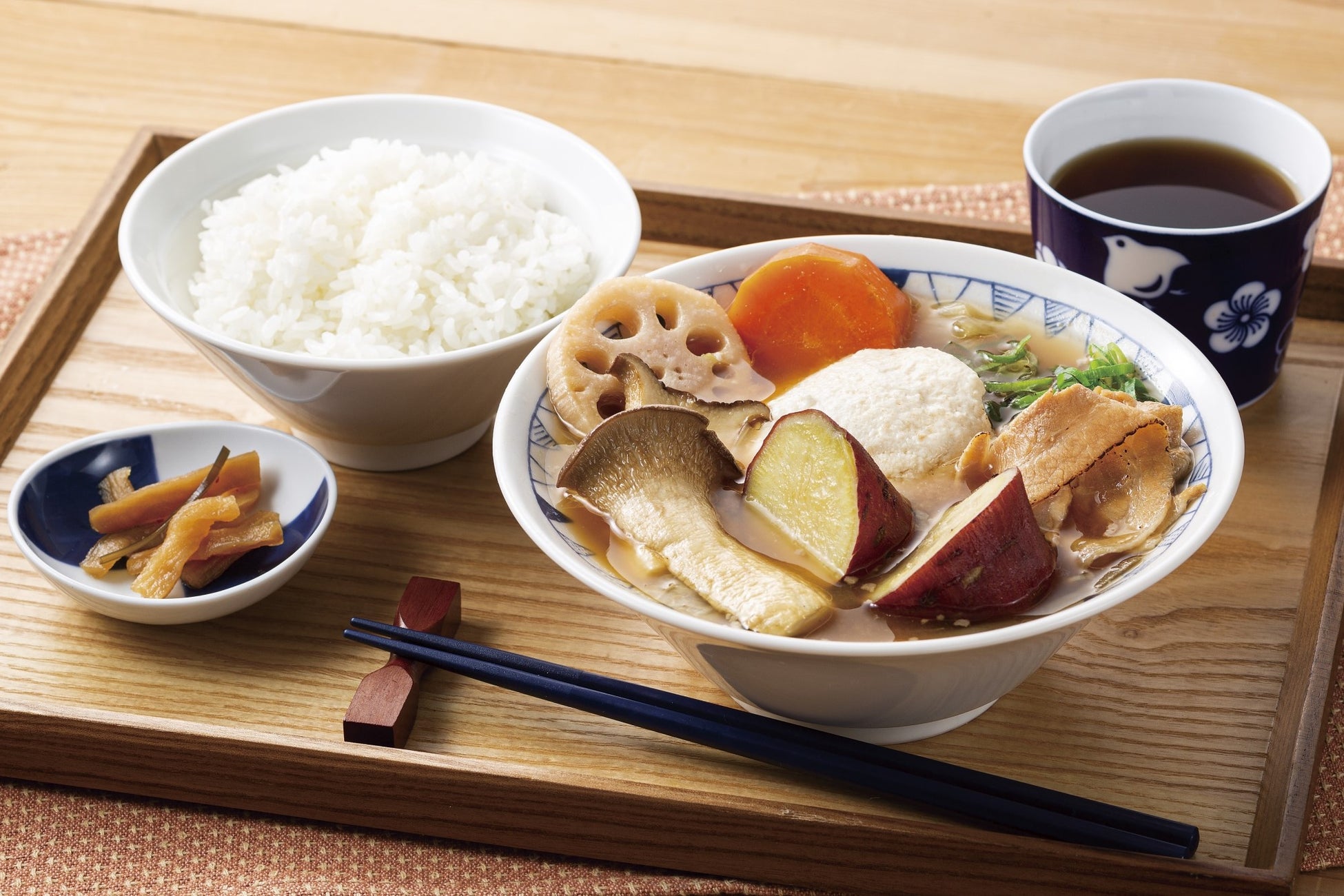 なめらかな食感と濃厚ながら上品な甘さのさつま芋「シルクスイート」を使用した「石焼き芋豚汁定食」は、石焼き芋をはじめ蓮根やにんじんなどの野菜をゴロッと盛りつけたシンプルな印象ですが、いざ口に運ぶとポタージュのような少しとろみがかった口当たりと塩味強めの米味噌ベースが特徴的な一杯に。ポタージュのようなとろみの秘密は、味噌と合わせた「石焼き芋」ペースト。秋の味覚を見た目にも、食べても感じる秋の豚汁定食が誕生しました。