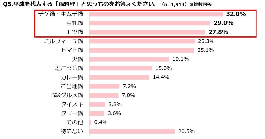 ・平成を代表する「鍋料理」は「チゲ・キムチ鍋」「豆乳鍋」「モツ鍋」がTOP3。