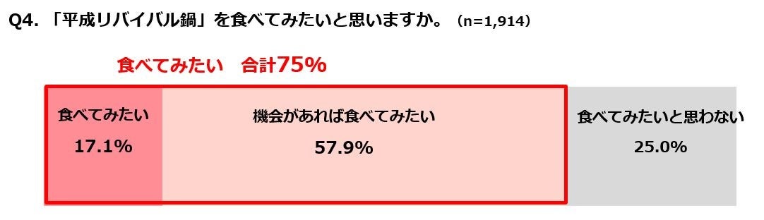 ・75%の人が“平成リバイバル鍋™“を「食べてみたい/機会があれば食べてみたい」と回答。