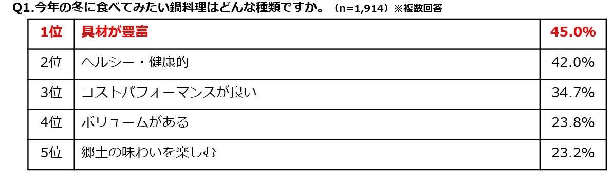 ・食べてみたい鍋料理の種類は「具材が豊富」「ヘルシー・健康的」「コスパが良い」がTOP3。