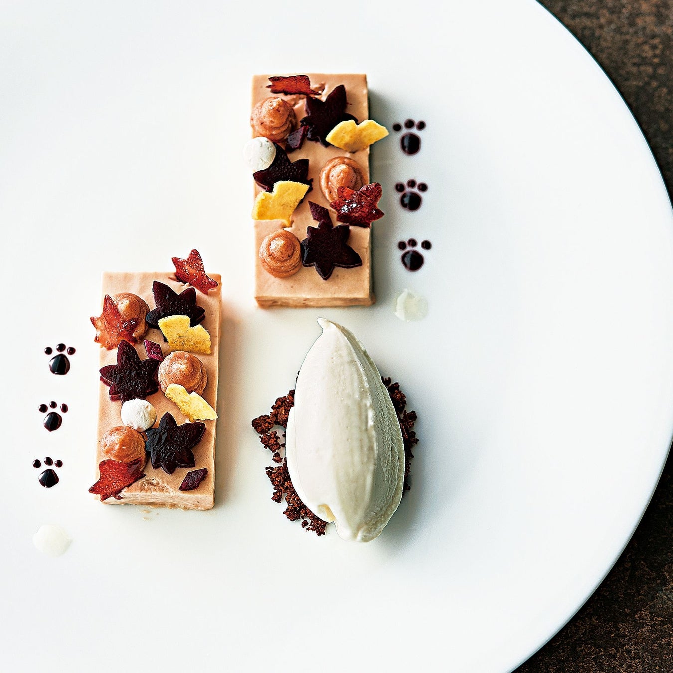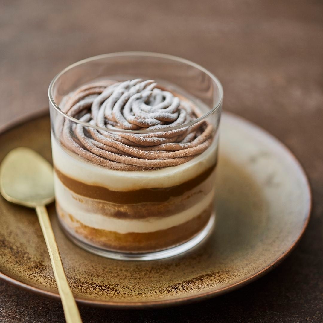 マロンクリームとマスカルポーネクリームのティラミスは、ほうじ茶シロップの香ばしさとキャラメルソースのほろ苦さ、オレンジのコンフィチュールの酸味がアクセント。こっくりと濃厚な味わいを軽やかな口溶けで楽しみたい。
