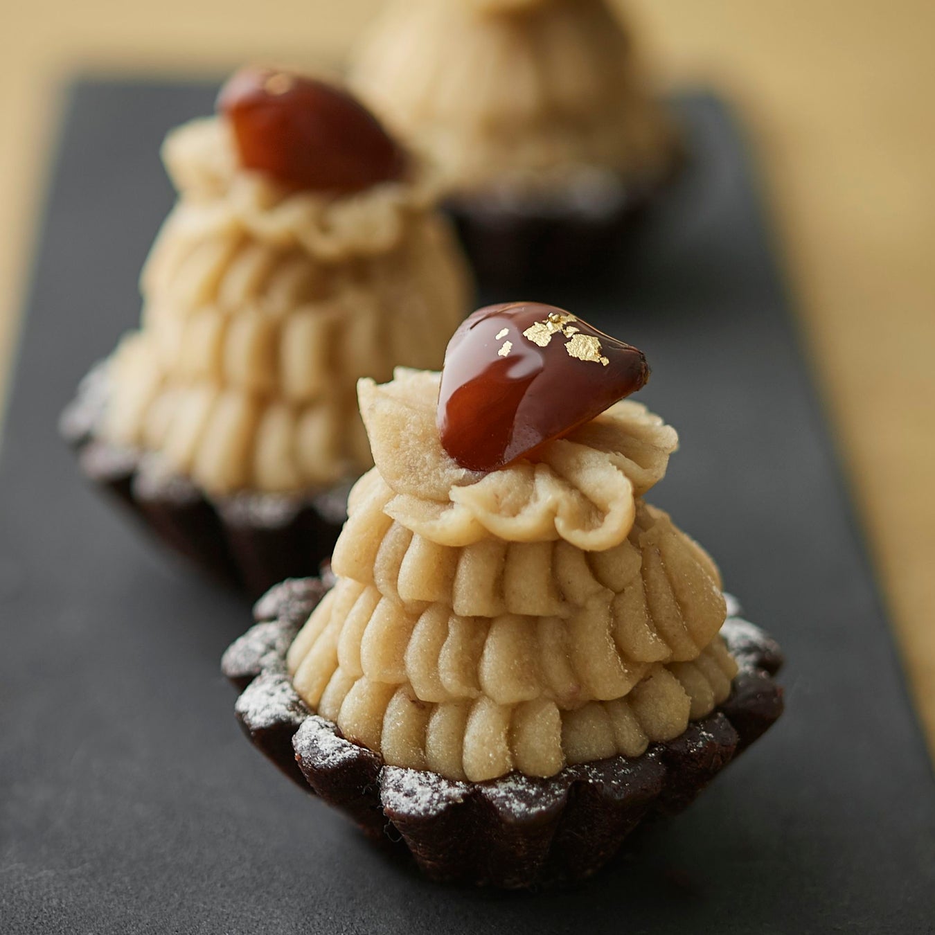 ココアタルトに愛媛県城川産の和栗クリームをフリルのように重ねたモンブラン。上品なミニサイズながらミルキーなマロンクリームとコク深いマロンチョコクリームを包み込んだ人気の姫ケーキは愛らしく手土産にもぴったり。