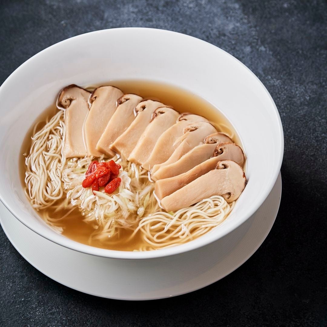 唐シェフの新しいセンスが吹き込まれたシンプルでモダンな上湯麺は、中国ハム、牛スネ肉、豚スネ肉、丸鶏を8時間かけて、じっくり丁寧に炊き上げて作る極上のスープが味の要。希少性の高い雲南省産の松茸の香り高い風味を思う存分に堪能して。