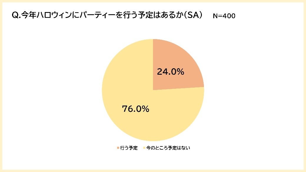 今年ハロウィンパーティーを行う予定を聞くと、「行う予定」と答えた人は24.0%と2割程度にとどまり、少数派であることがわかりました。