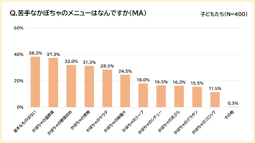 一方、苦手なメニューを聞くと、「苦手なものはない」と38.3%の人が答えましたが、「かぼちゃの温野菜」(37.3%)、「かぼちゃの野菜炒め」(32.0%)が上位に入りました。また、好きなメニューの3位でもあった「かぼちゃの煮物」(32.0%)が苦手なメニューでも上位に入りました。