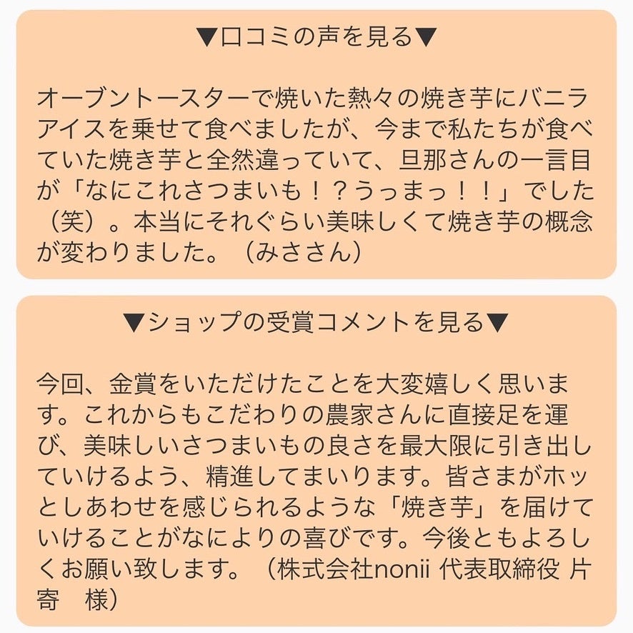 『今回、金賞をいただけたことを大変嬉しく思います。これからもこだわりの農家さんに直接足を運び、美味しいさつまいもの良さを最大限に引き出していけるよう、精進してまいります。皆さまがホッとしあわせを感じられるような「焼き芋」を届けていけることがなによりの喜びです。今後ともよろしくお願い致します。』