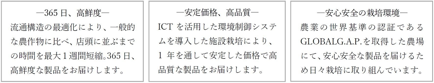 たねまき・たねまき常総では、従来の農業では難しいとされていた、こうした市場のニーズを取り入れたマーケットイン型の生産活動に取り組んでいます。「製販一体」の組織体制により、生産から販売先との契約までを自社で一貫して行い、流通構造を最適化。これにより、一般的な農作物に比べ店頭に並ぶまでの時間を最大1週間短縮し、高鮮度な製品のお届けを実現しています。また、ICTの活用により農場内の環境を24時間制御し、安定収穫を可能にしたことで、通年で安定した価格・品質にてお客様に製品をお届けいたします。