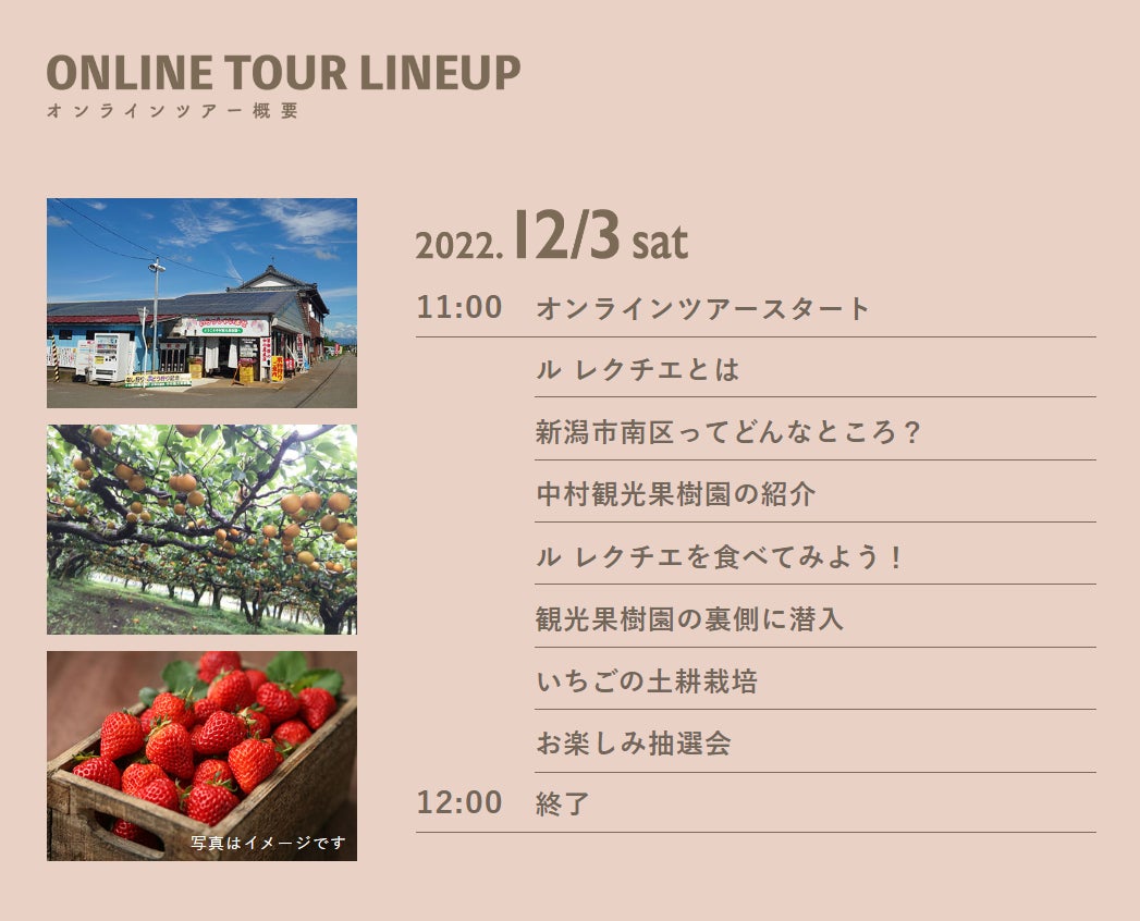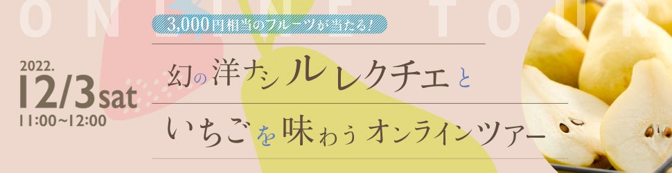 今回のオンラインツアーのテーマは、ル レクチエです。栽培が難しく流通量が少ないことから「幻の洋ナシ」ともいわれるこの高級品種は、とろけるような舌ざわりと濃厚な甘さが特徴です。ちょっと早いクリスマスプレゼントに、自分へのご褒美に、観光農園のツアーを楽しみながら味わってみてはいかがでしょうか。Aコース参加者には事前にル レクチエが届くのに加え、3名様に3,000円相当のフルーツが当たります。