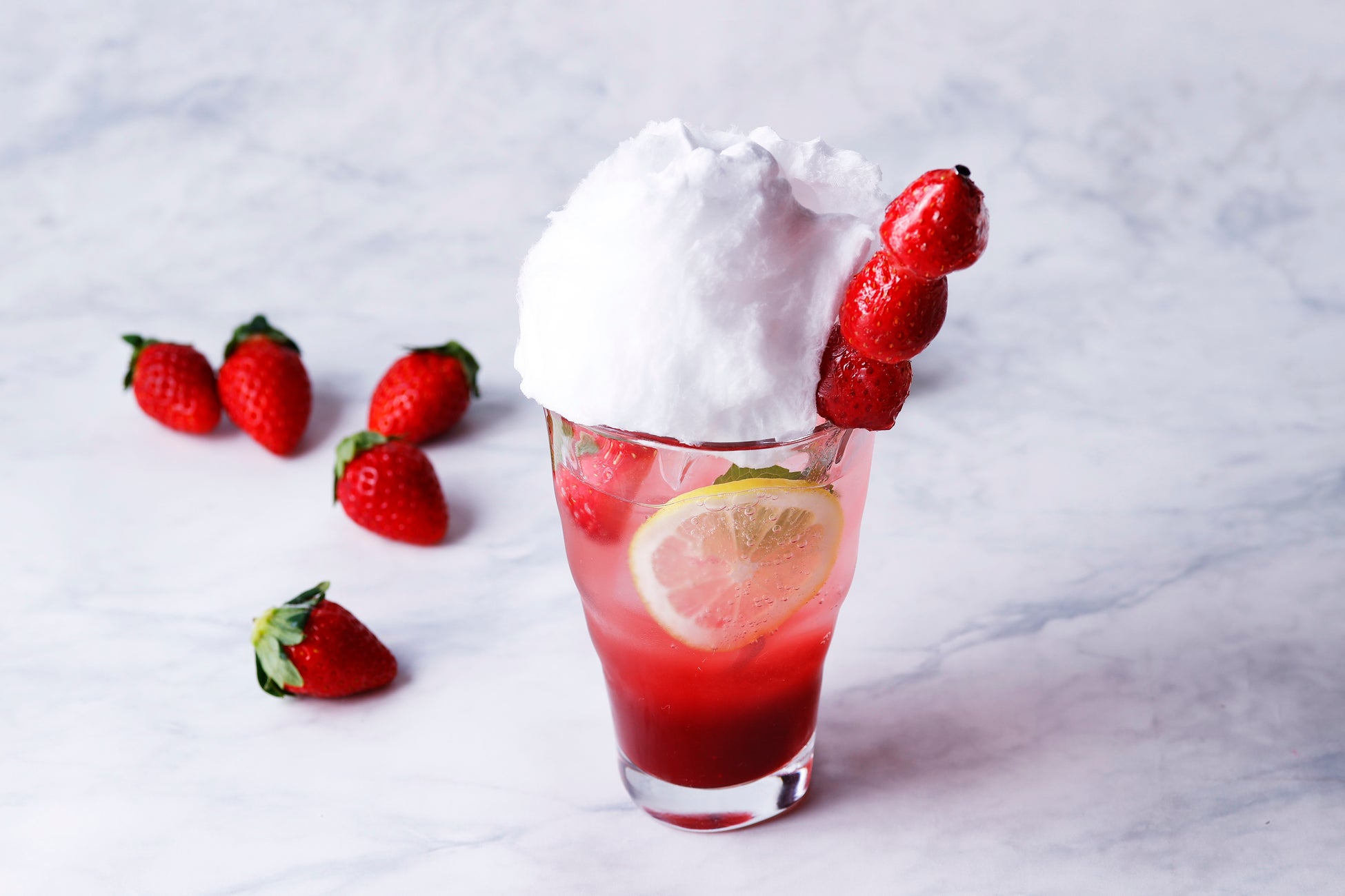 また、「いちごキャンディーモクテル」は、いちごのピューレにライムやミントを合わせた爽やかなベースに、コットンキャンディーをふんわりと乗せ、いちご飴を添えてご提供。ソーダを注いで仕上げると、コットンキャンディーの甘みが加わりチャーミングな味わいをお愉しみいただけます。