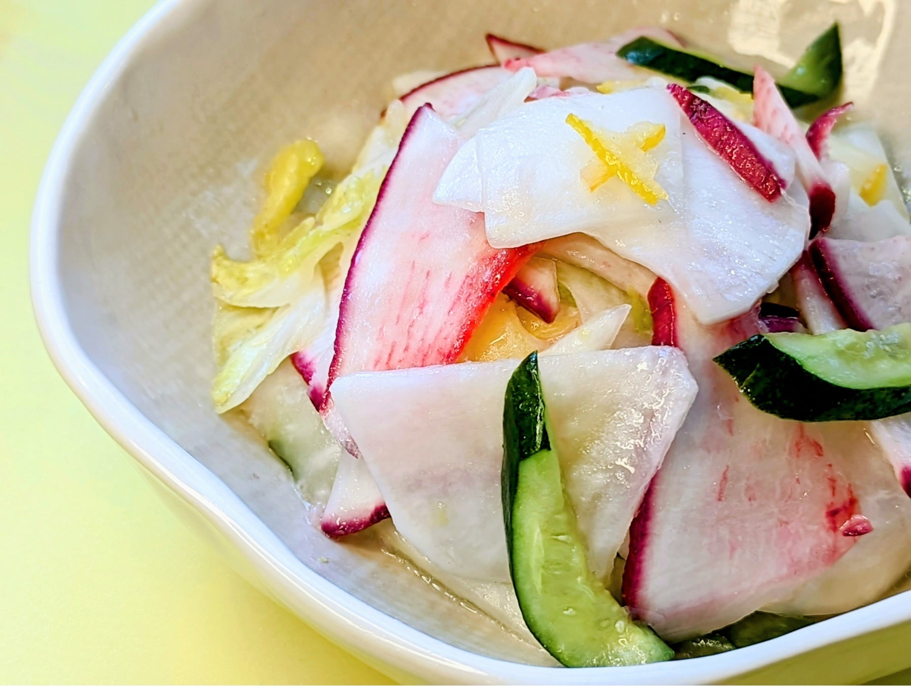 旬のやわらかな赤かぶと白かぶ、白菜、きゅうりを、柚子風味のドレッシングで和えました。ほんのりと酸味が効き、さっぱりとした味わいが、野菜の優しい甘さを引き立たせます。