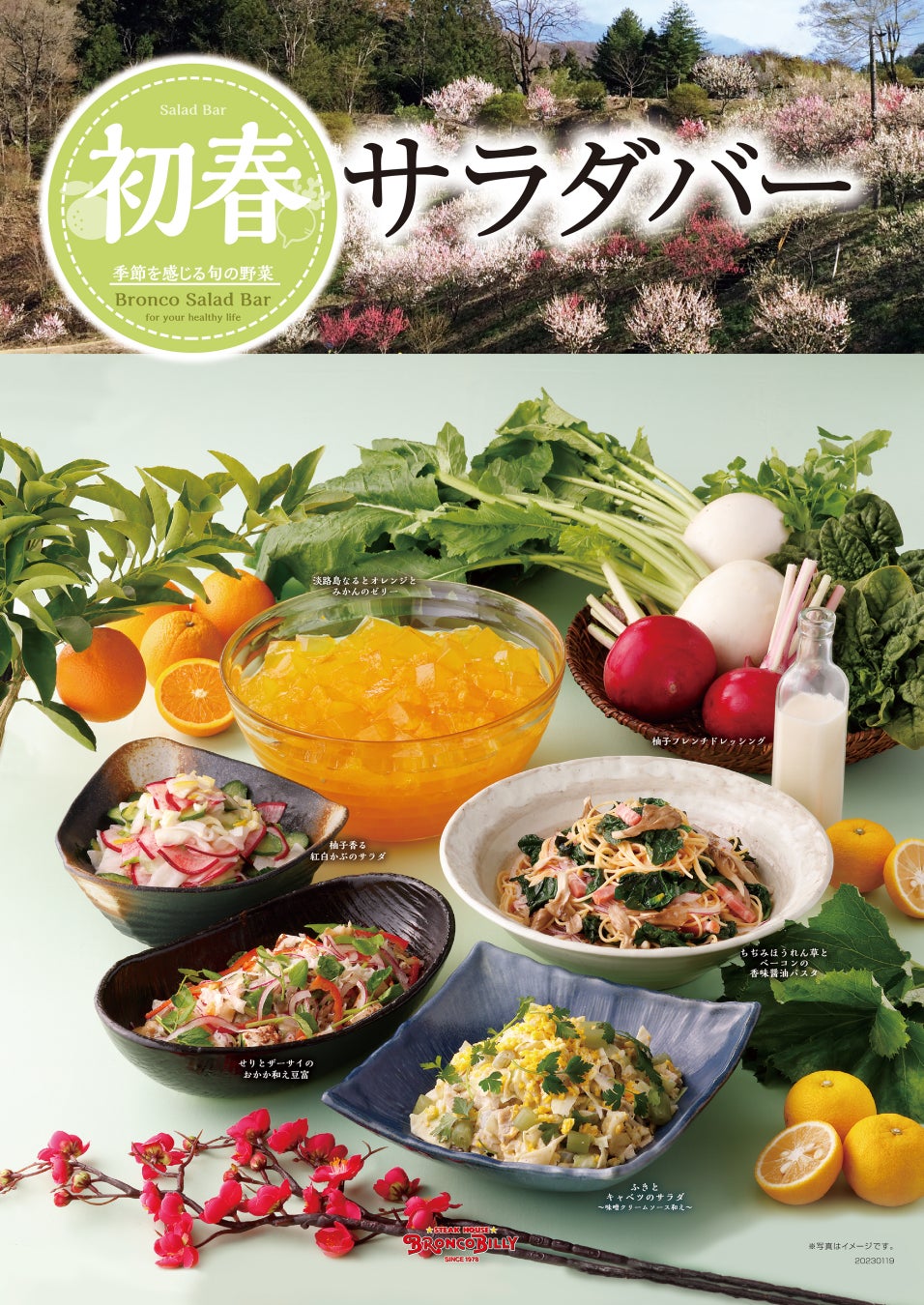 新鮮な野菜が好きなだけ食べられると大人気の、ブロンコビリーのサラダバー。この度、初春ならではのほろ苦い「せり」や「ふき」、寒さにより甘さが増した「かぶ」や「ちぢみほうれん草」など、旬の野菜をふんだんに使用した『初春サラダバー』5品をご用意しました。
