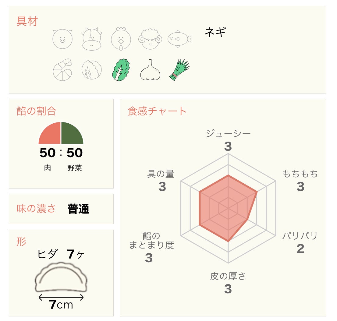 「焼餃子・水餃子・揚餃子・蒸餃子」をはじめとして、皮の「もちもち度」や「パリパリ度」、餡の「ジューシー度」、使われている「具材」などの特徴から餃子を検索することができます。