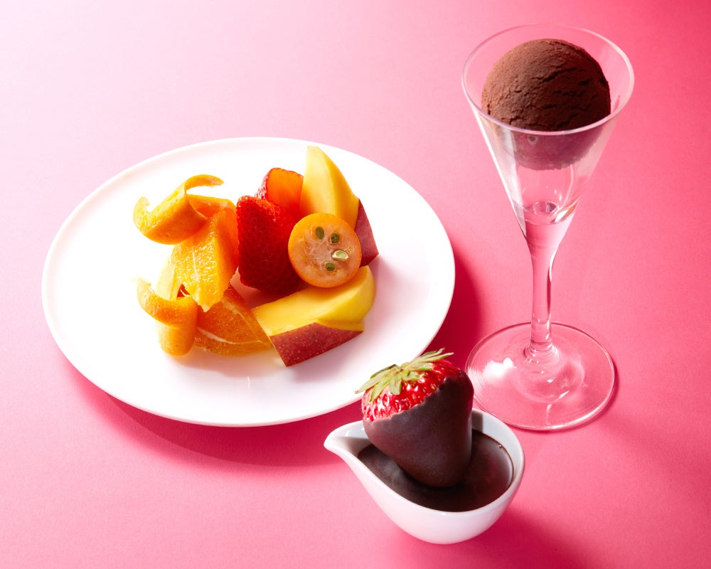 カットフルーツやデザートを組み合わせて、チョコソースにフォンデュしたり、チョコアイスを添えてお召し上がりいただきます。自分でカスタマイズできる楽しさもあります。チョコアイスは自社製で、くちどけなめらかなコクのある味わいです。
