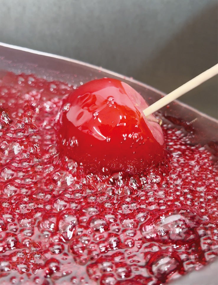 りんごだけでなく、いろいろな食材で作ることを革新した福留店長。季節ごとにさまざまなフルーツ飴が登場します。現在展開しているメニューはりんご飴・プレーン(550円)、りんご飴・シナモン(650円)、いちご飴(500円)、ブドウ飴(550円)、トマト飴(450円)。これからは、りんご飴のホワイトチョコや意外な食材を使った飴も登場予定。