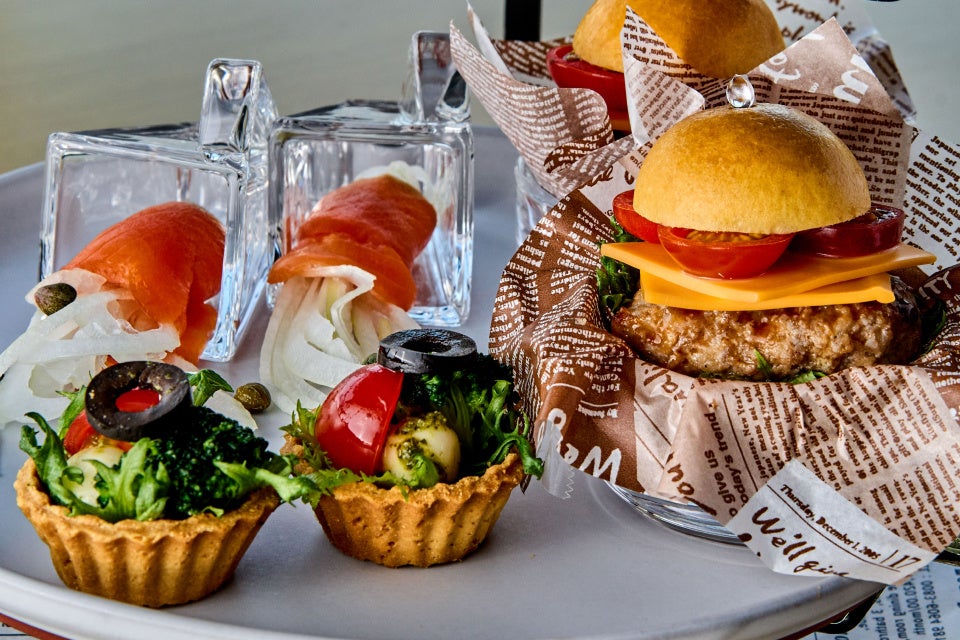 下段には、女性の方が食べやすい一口サイズのハンバーガーやカプレーゼのミニタルトなどがご堪能いただけます。