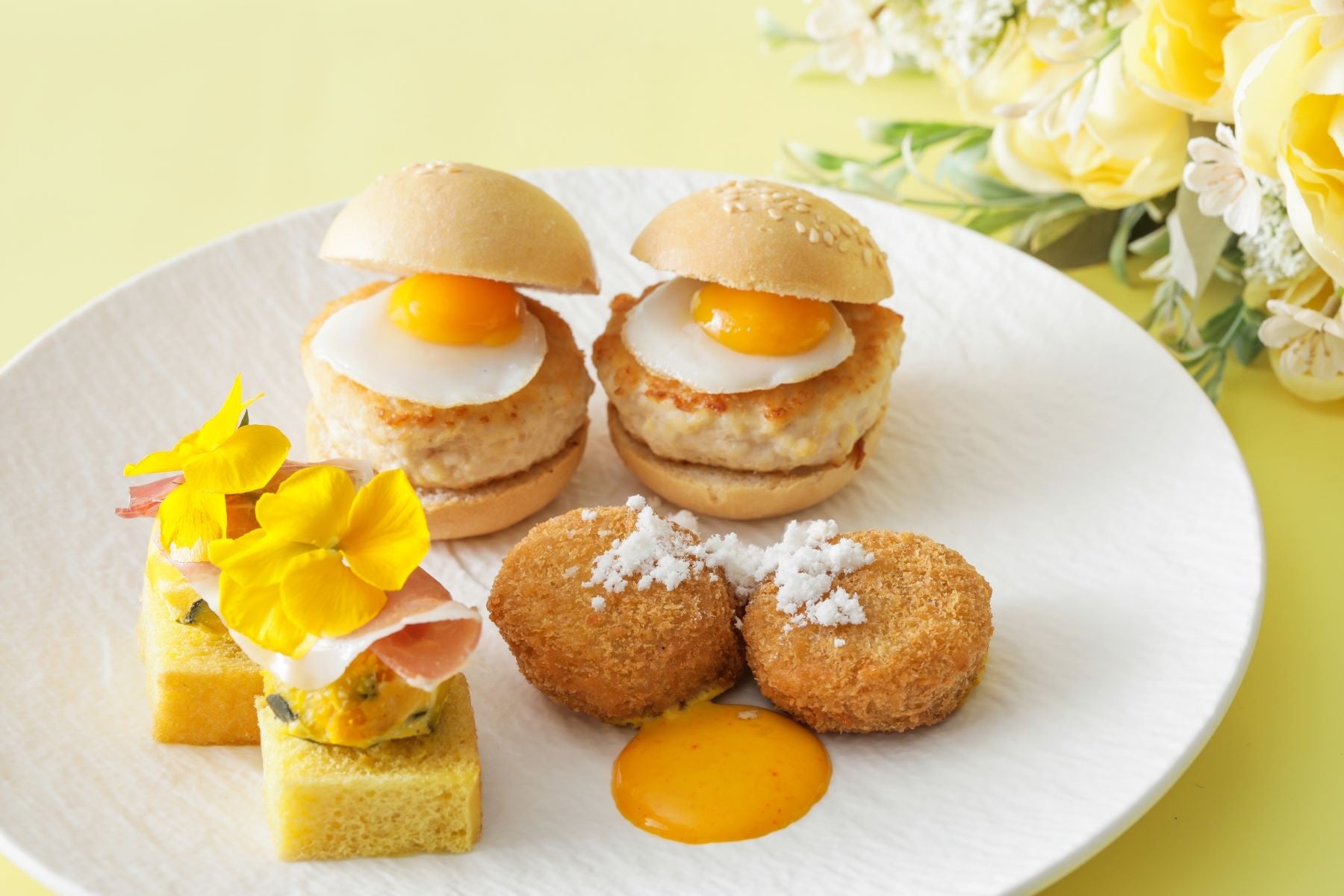 ・セイボリー:シェフ特製3種のセイボリー(てりやき鶏玉バーガー/トマトバジルリゾットのライスコロッケ/カボチャと生ハムのサンド)