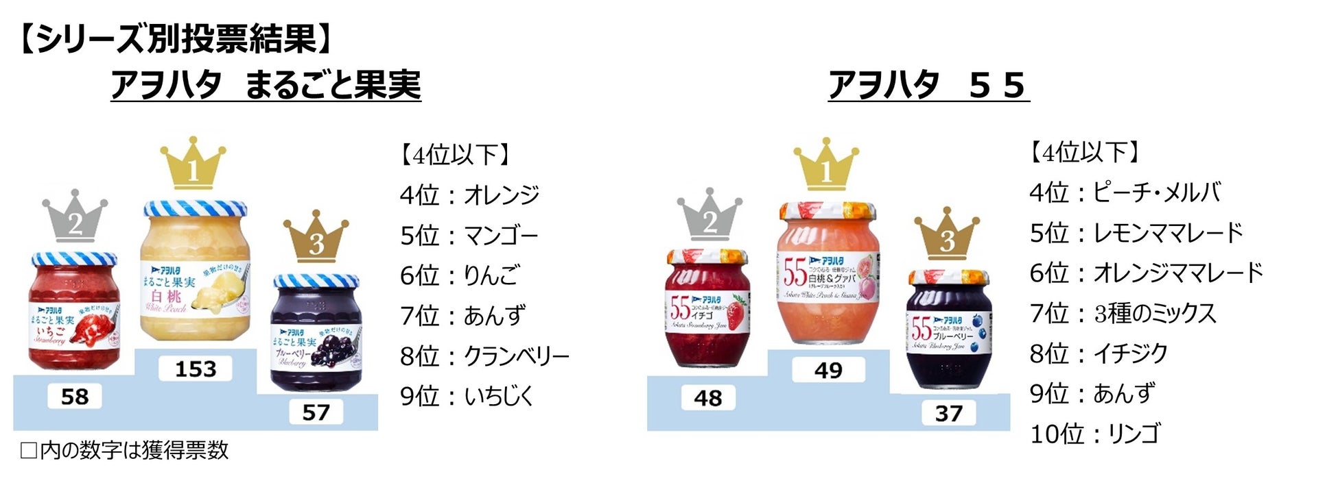 「アヲハタ 55」シリーズでは、2023年の春から通年商品となった「55 白桃&グァバ(グレープフルーツ入り)」が第1位に。「年中いつでも買えるようになって嬉しい」という声があがりました。今回、「人におすすめしたい」という視点で選択したことで、定番商品はもちろん、ぜひ食べてみてほしい、と感じる商品に票が集まる結果となりました。