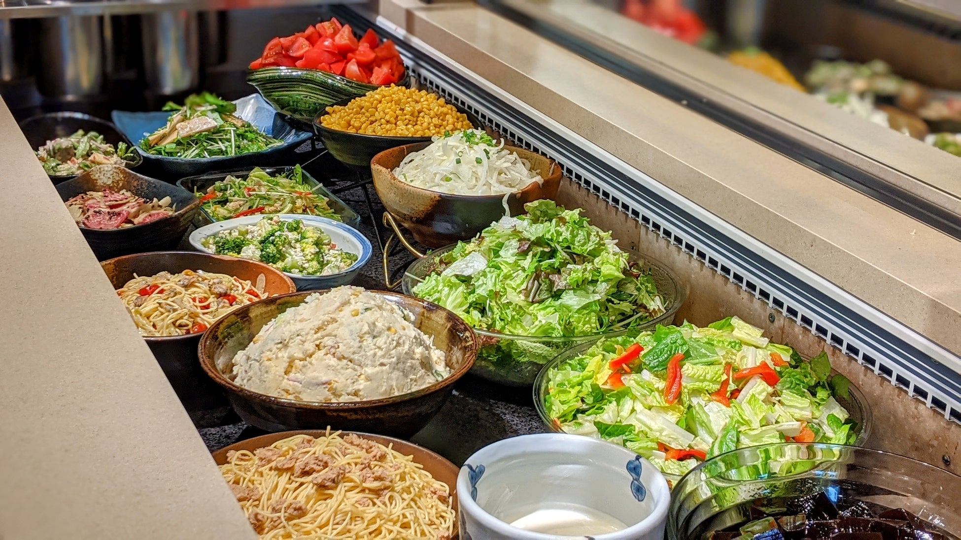 「ロメインレタス」「トマト」「やわらかキャベツ」「パリパリレタス」「わかめ」「つぶつぶコーン」「オニオンスライス」「たまごマカロニサラダ」「フルーツ盛り合わせ」「えびせん」※ディナー限定「生八ツ橋&粒あん」「牛乳プリン 苺ソースがけ」(季節により内容は変更いたします)