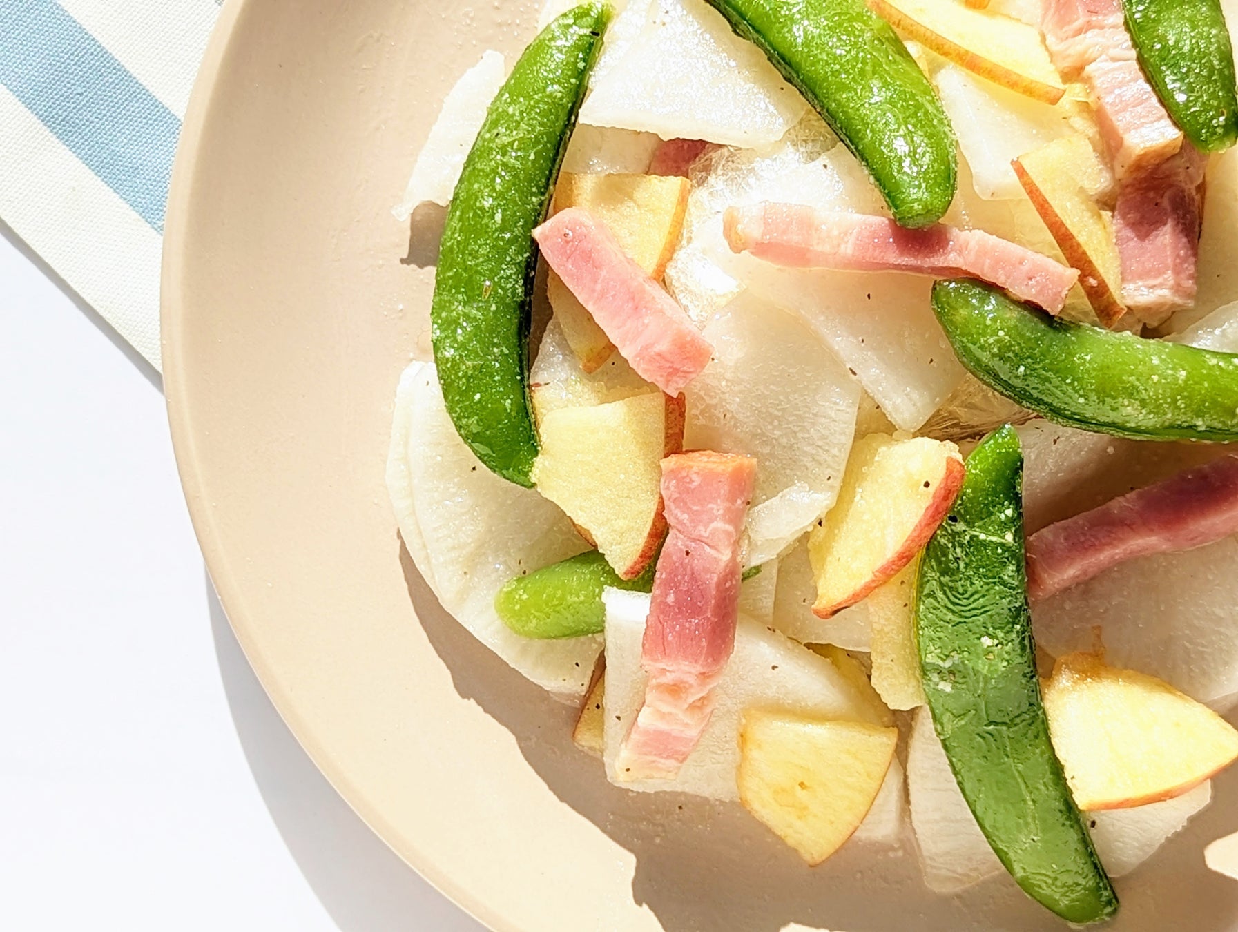 肉厚でシャキッとした、スナップエンドウの甘みを楽しめます。スナップエンドウ、大根、りんご、ベーコンを、ごま油が香るコクのあるチーズソースに絡めました。ほのかに甘酸っぱいりんごにより、後味はさっぱりとしています。