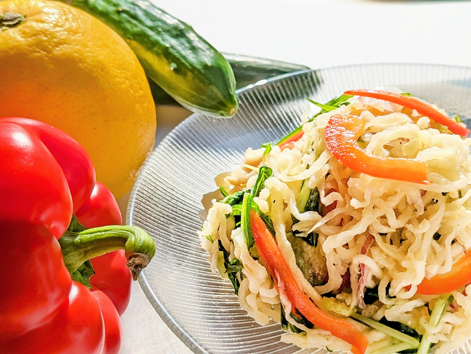 切り干し大根と旬のパプリカ、きゅうり、セロリ、さらに蒸しチキンに、ナンプラーが効いた南国風の日向夏ドレッシングを絡めました。切り干し大根の食感がよく、爽やかな香りと酸味により、さっぱりとお召し上がりいただけます。