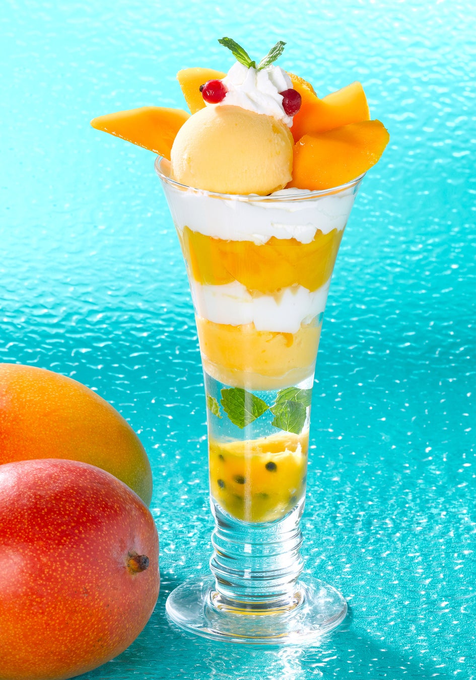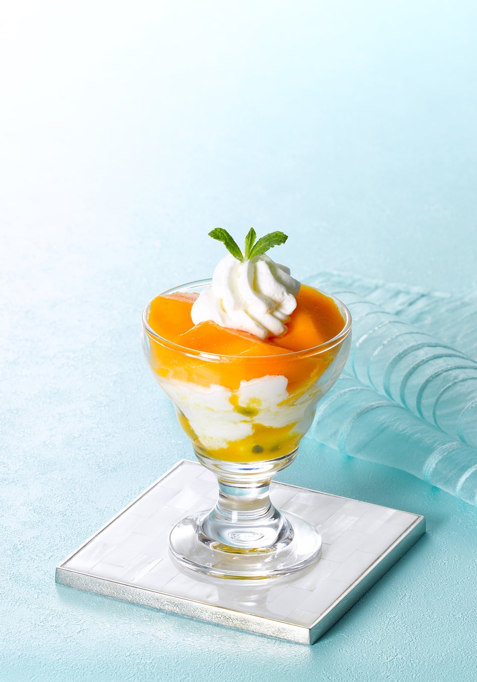 ジューシーでとろけるようなアップルマンゴーの濃密な香りをそのままに味わえるパフェです。ワイングラスに盛り付けて、よりスタイリッシュになりました。