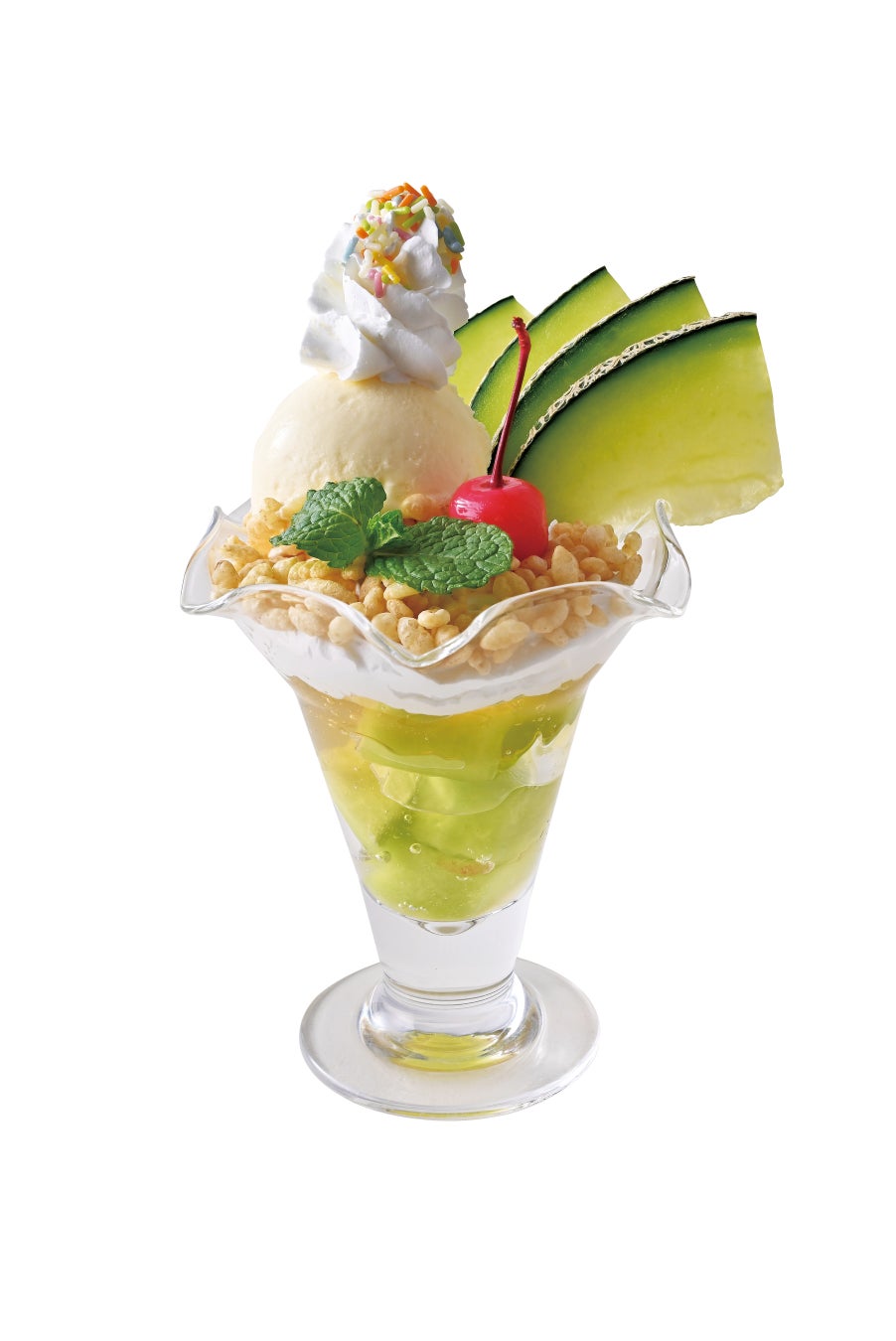 ジューシーな鉾田メロンを贅沢に使用し、さっぱりと仕上げたパフェです!鉾田メロン果肉、ゴールドシャンパンジュレ、生クリーム、バニラアイス、チェリー、カラースプレーチョコを使用しています。