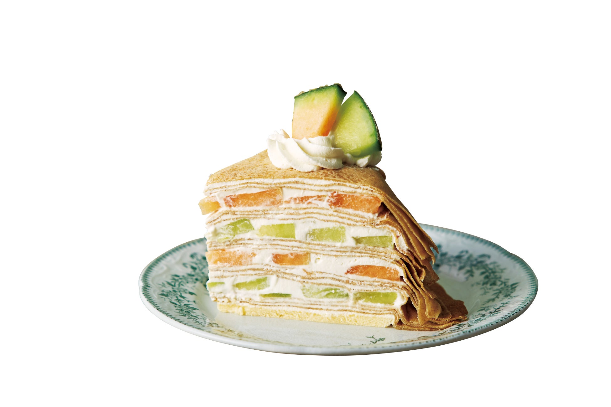 赤と緑の2種類の鉾田(ほこた)産メロンをたっぷり使用し、ホワイトラム入りのホイップクリームと15枚のクレープ生地を丁寧に重ねました。