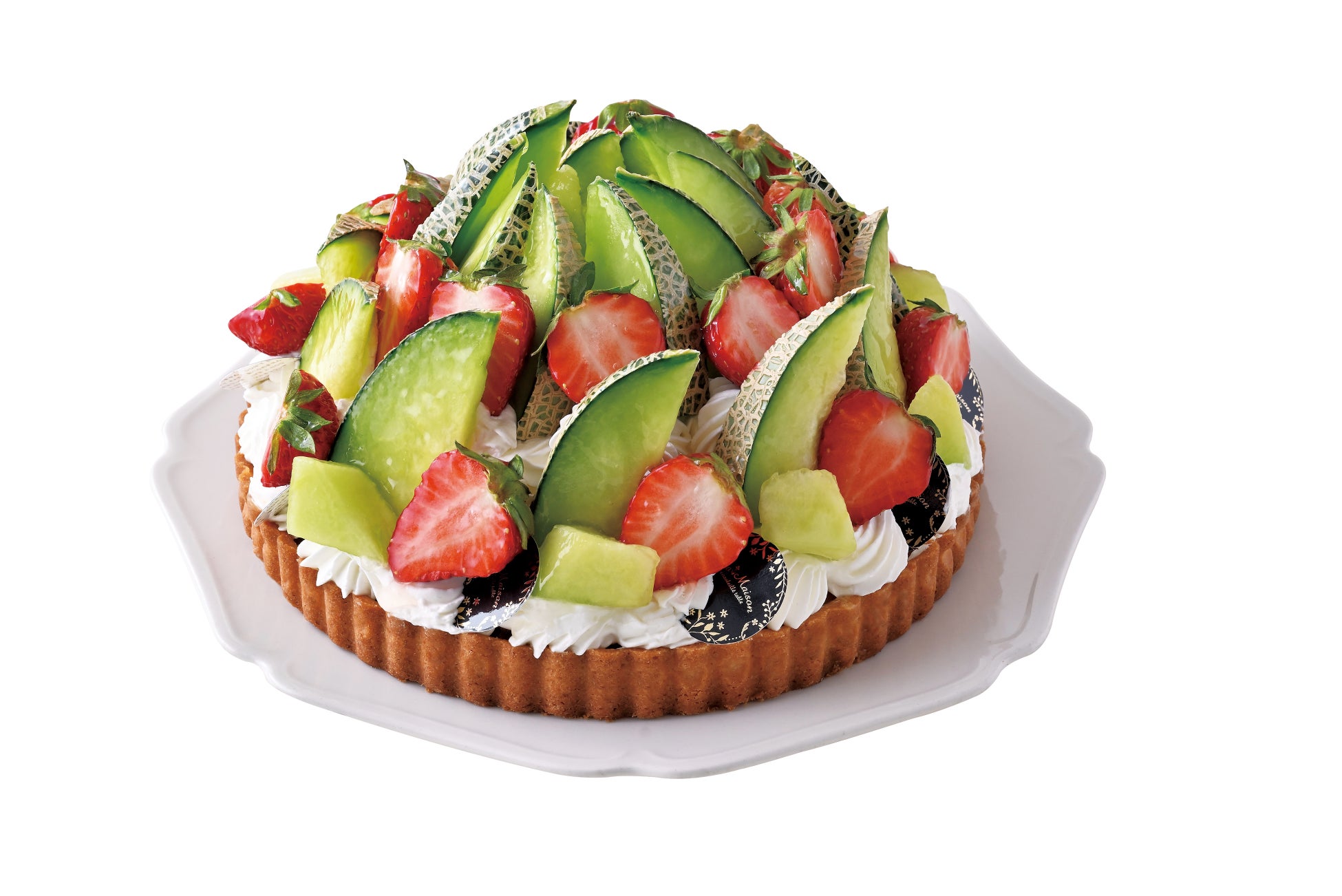 アーモンドタルトにカスタードクリームを重ね、鉾田メロンなど8種のフルーツを彩り鮮やかに飾りました。