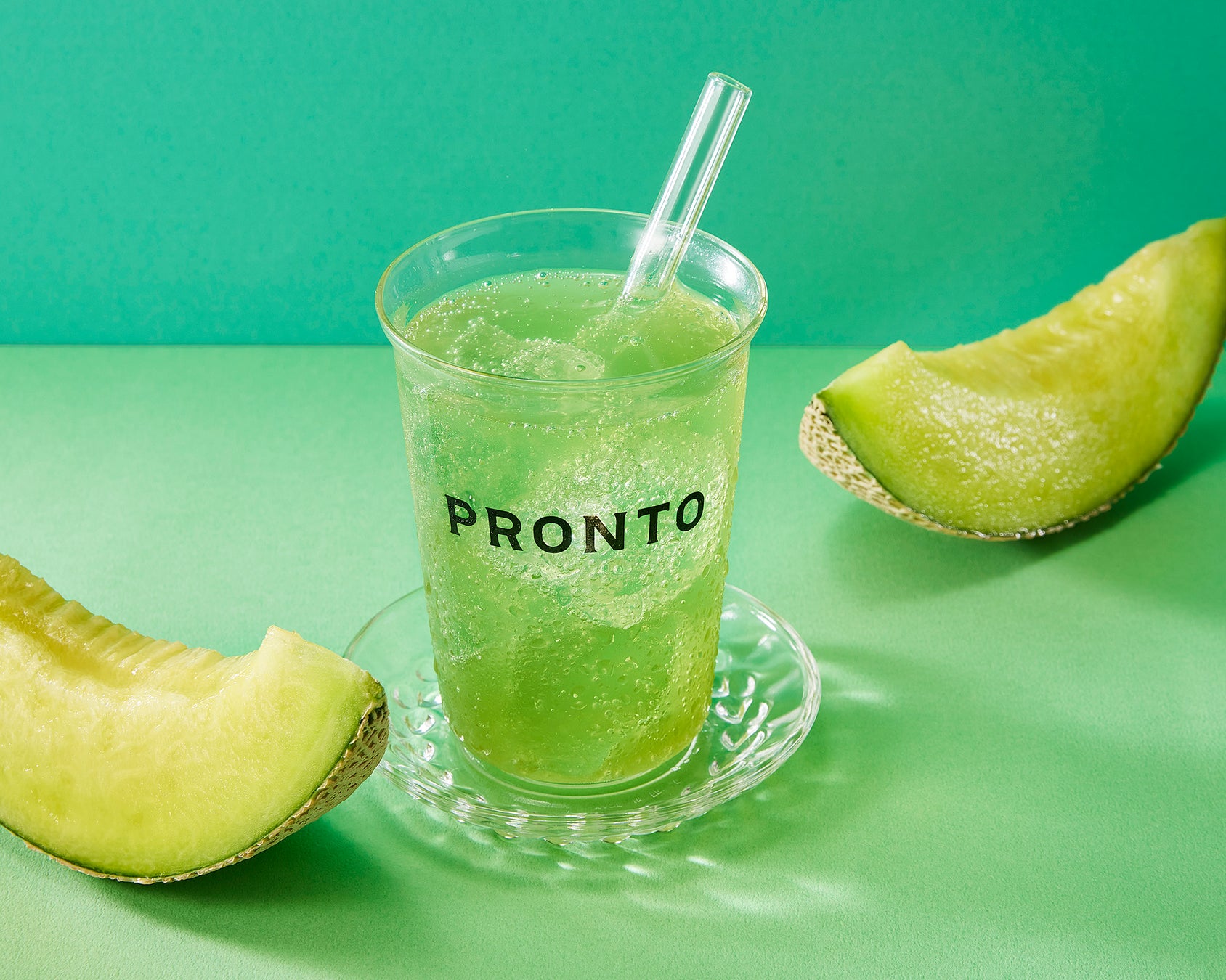 「メロンパフェラテ」と「メロンスカッシュ」 に使⽤しているプロントオリジナルのメロンソースは、⽢味が非常に強く、果汁が豊富で、すっきりとした後味が特徴の熊本県産“肥後グリーンメロン”を使用。産地のひとつである熊本県八代市は、海が近くミネラルを豊富に含むメロン栽培に適した土質です。また、朝晩と⽇中との寒暖差がある環境も、高糖度なブランドメロンが育つ大切な条件。さらに、糖度を高める栽培方法や1つの苗に1つの実がなるように手作業で丁寧に採果、冷涼な朝に収穫し、低温のままメロンを出荷等、生産者のこだわりが詰まっています。そんな高糖度な “肥後グリーンメロン”を使用したプロントオリジナルのメロンドリンクを、是非この機会にお楽しみください。※2