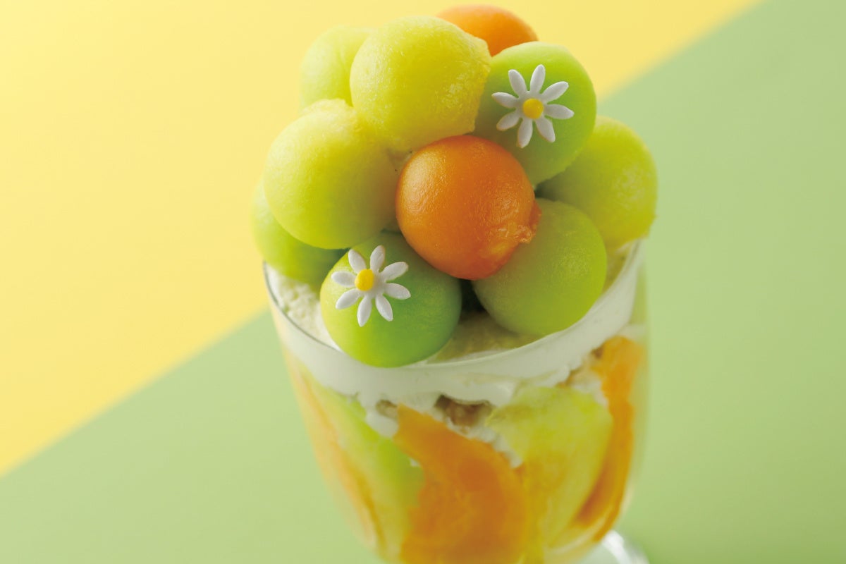 厳選したアンデスメロンと赤肉メロンを贅沢に使用し、葉っぱをイメージしてカットされたメロンの層に、まるくくり抜いた可愛らしいメロンをふんだんに盛り付けました。
