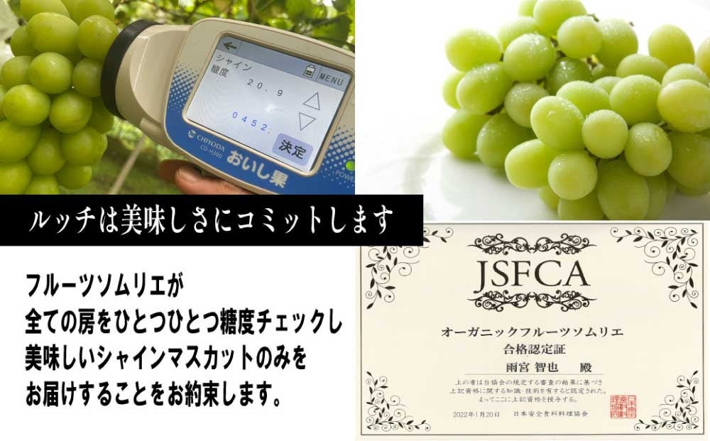 【注意】黄色くても甘くないシャインマスカットもあります。だからルッチフルーツは、しっかり全ての房を検査して糖度保証をおつけして責任と自信を持ってお届けします!