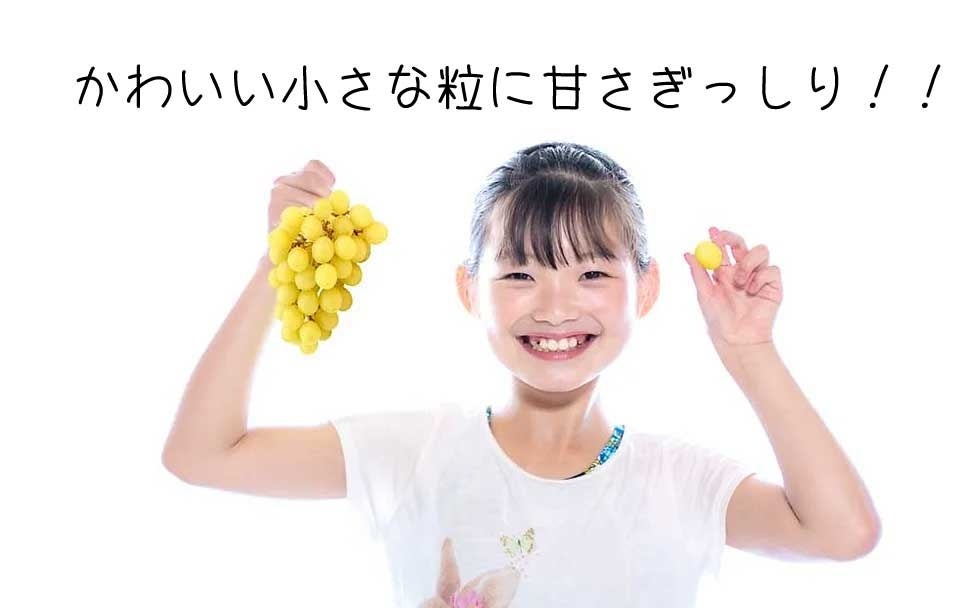 大人シャインマスカットとは別に黄色く甘いシャインマスカットが存在します。それは苗木を植えてから2~3年の若い樹に成る、小粒で黄色いシャインマスカットです。若い樹は樹勢(元気があり)が強く、ぶどうの粒が大きくなる前に糖度が上がり黄色くなってしまうのです。房形にバラつきがありますが、大人シャインマスカット同様に極甘!!子供のようにかわいらしい小粒に甘さがいっぱい詰まっていることから「こどもシャインマスカット」(商標登録済)命名させていただきました。このこどもシャインマスカットも植えたばかりの樹から一定期間しか採れず貴重な存在です!