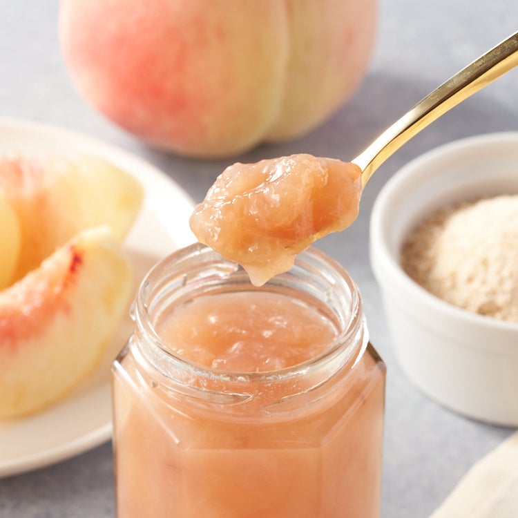 そのまま食べてもおいしい完熟桃は、変色防止のために一度凍らせ、一つひとつ手作業で皮をむいてから、職人の手によりジャムに仕上げました。加熱温度や糖度を細かく調整しているので、桃らしい香りとピンク色も楽しんでいただけます。