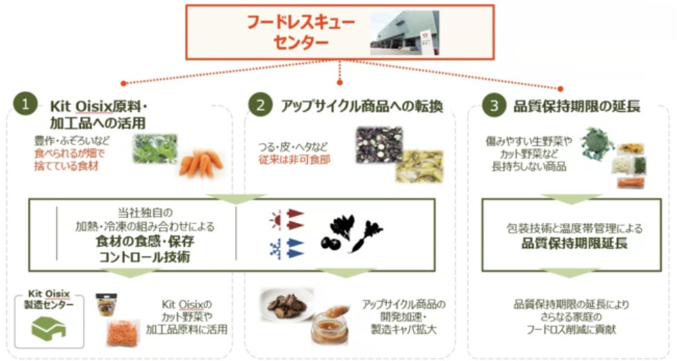 当社は2020年11月にグリーン戦略を掲げており、その中の1つとしてフードロスの削減に取り組んでいます。「フードレスキューセンター」は、食材の食感・保存のコントロール技術を用い、産地や流通過程で生まれていたフードロス削減の他、アップサイクル加工などが実現でき、より一層のフードロスの削減が可能になる施設で、2025年には年間1,000トンのフードロス削減達成を目指します。